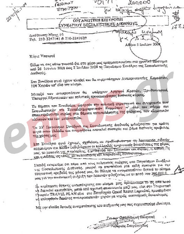 Όπως βλέπετε από τα έγγραφα που παρουσίασε ο Πάνος Καμμένος, τα χρήματα προορίζονταν για την κάλυψη των εξόδων φιλοξενίας των αποστολών που συμμετείχαν στο 23ο Παγκόσμιο Συνέδριο της Σοσιαλιστικής Διεθνούς που έγινε στην Αθήνα από τις 26 Ιουνίου έως τις 2 Ιουλίου του 2008.