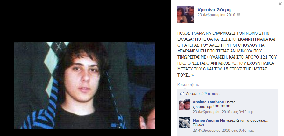 Στο παρελθόν η ίδια μέσω του Facebook έχει ζητήσει και τη σύλληψη των γονέων του Αλέξη Γρηγορόπουλου.”Πότε θα κάτσει στο σκαμνί η μάνα και ο πατέρας του Αλέξη Γρηγορόπουλου για “παραμέληση εποπτείας ανηλίκου” που τιμωρείται με φυλάκιση” έγραψε στις 23 Φεβρουαρίου 2010.
