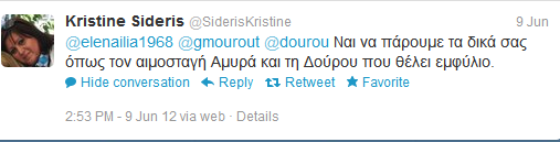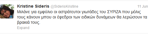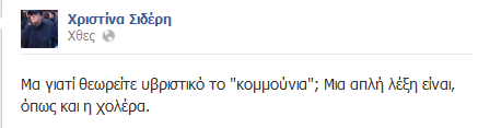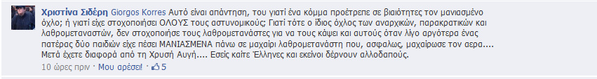 “Mετά έχετε διαφορά από τη Χρυσή Αυγή…Εσείς καίτε Έλληνες και εκείνη δέρνουν αλλοδαπούς”, έγραψε σε κάποιον που διαφώνησε με τις απόψεις της.