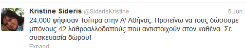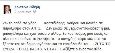 Κατά του ΣΥΡΙΖΑ και των στελεχών του επιτίθεται μέσω Facebook και Twitter το στέλεχος της ΝΔ Χριστίνα Σιδέρη, η οποία ήταν ανάμεσα στα 29 άτομα που είχαν συλληφθεί στον Άγιο Παντελεήμονα στις 24 Φεβρουαρίου του 2010, στο πλαίσιο των ταυτόχρονων συγκεντρώσεων που είχαν προγραμματίσει τότε ακροδεξιές ομάδες και ομάδες προάσπισης των δικαιωμάτων των μεταναστών, στην περιοχή του Αγίου Παντελεήμονα. Σύμφωνα με την ιστοσελίδα left.gr η Χριστίνα Σιδέρη, η οποία είναι υπεύθυνη της Β3 νομαρχιακής της ΝΔ, σχολιάζοντας την επίθεση του Ηλία Κασιδιάρη κατά της Λιάνας Κανέλλη και της Ρένας Δούρου έγραψε μεταξύ άλλων στο προφίλ της στο Facebook.”Εμ κοριτσάρες εσείς και όλα τα κομμούνια το ξεκινήσατε το πανηγύρι, τώρα καλείστε να ζήσεσε και ότι δημιουργήσατε και τα επακολουθά του”.