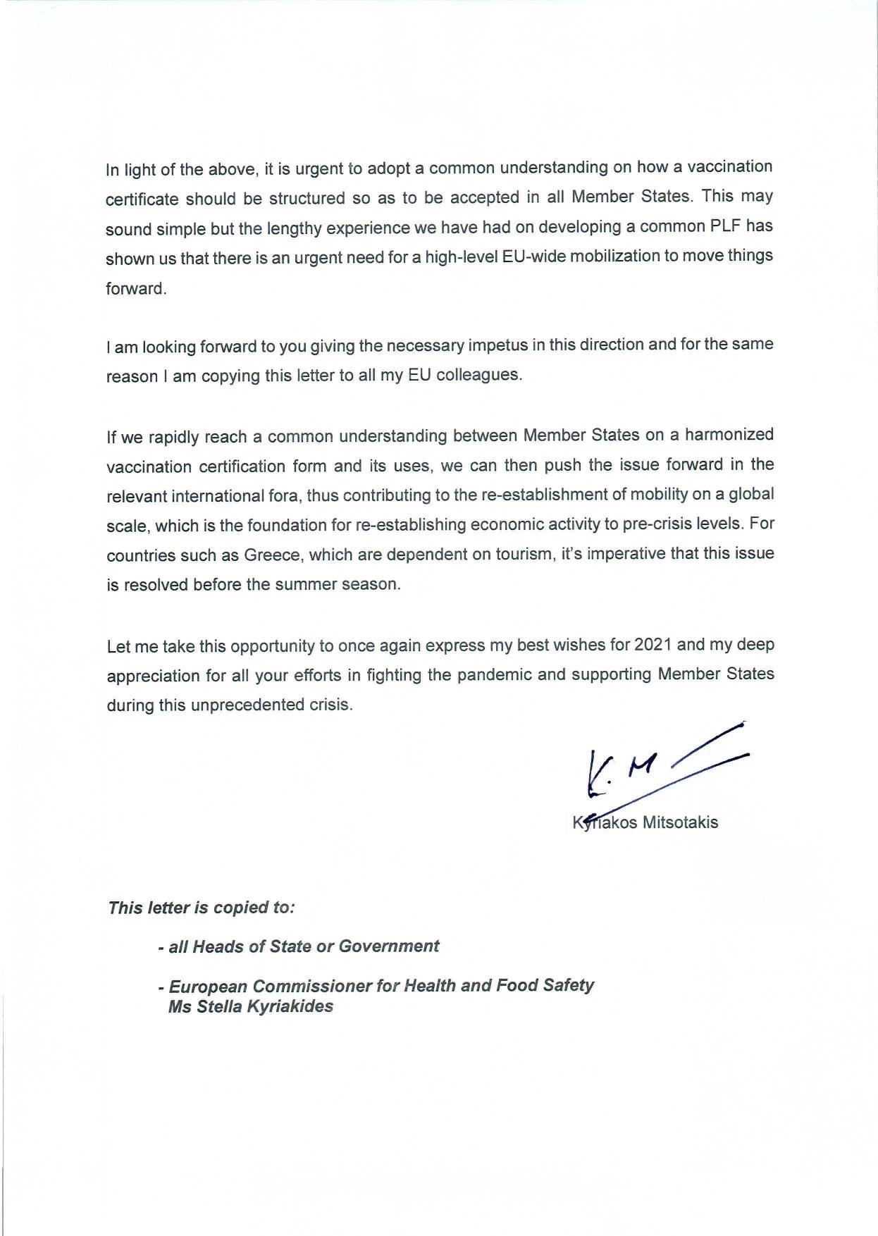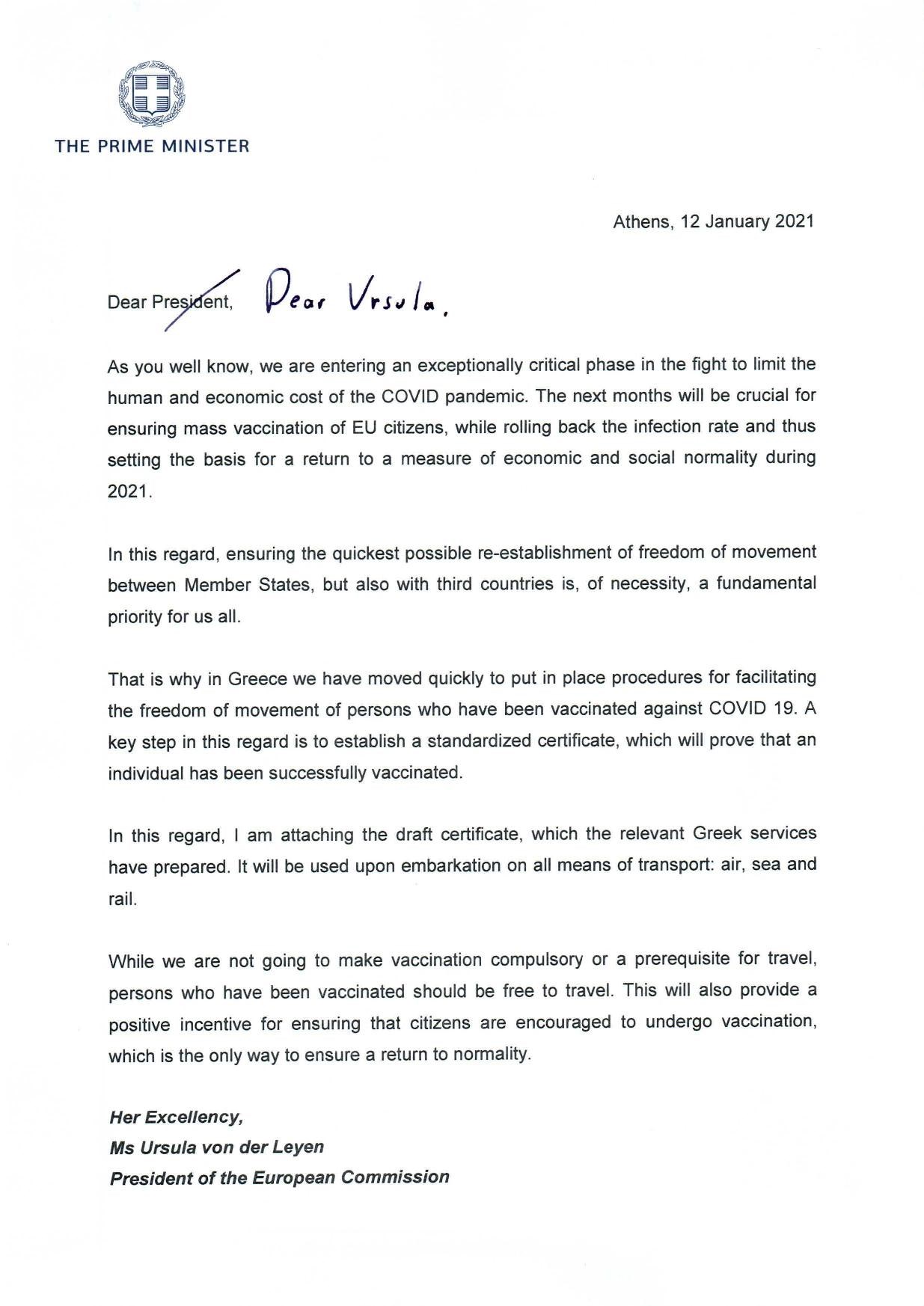 Επιστολή προς την πρόεδρο της Ευρωπαϊκής Επιτροπής Ούρσουλα φον ντερ Λάιεν και όλους τους αρχηγούς κρατών και κυβερνήσεων της ΕΕ απέστειλε ο Έλληνας Πρωθυπουργός Κυριάκος Μητσοτάκης, με την οποία προτείνει να υπάρξει ένα πρότυπο ψηφιακό πιστοποιητικό εμβολιασμού. Συγκεκριμένα ο πρωθυπουργός σημειώνει ότι «η διασφάλιση της ταχύτερης δυνατής επανέναρξης της ελεύθερης κυκλοφορίας προσώπων μεταξύ των κρατών – μελών, αλλά και με τρίτες χώρες είναι μια θεμελιώδης προτεραιότητα για όλους μας» και προσθέτει «για το λόγο αυτό στην Ελλάδα, κινηθήκαμε γρήγορα και εφαρμόσαμε διαδικασίες για τη διευκόλυνση της ελεύθερης κυκλοφορίας προσώπων που έχουν εμβολιαστεί κατά του Covid-19. Ένα βασικό βήμα προς αυτή την κατεύθυνση είναι η δημιουργία ενός πρότυπου πιστοποιητικού, που θα αποδεικνύει ότι ένα άτομο έχει επιτυχώς εμβολιαστεί».