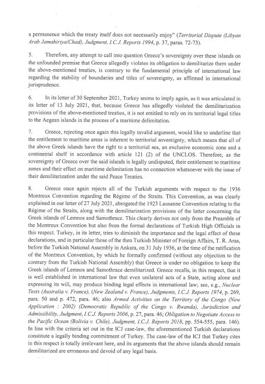 Συγκεκριμένα, απορρίπτεται το σύνολο της τουρκικής επιχειρηματολογίας όσον αφορά την «διασύνδεση» της ελληνικής κυριαρχίας των νησιών και των παρακείμενων νήσων του Αιγαίου με την δήθεν υποχρέωση αποστρατικοποίησης των νησιών αυτών. Τονίζεται ότι η διασύνδεση αυτή αποτελεί καθαρή αθέτηση τόσο του γράμματος όσο και του πνεύματος της συνθήκης της Λωζάννης του 1923 και της συνθήκης των Παρισίων του 1947, που ορίζουν μόνιμα σύνορα και εδαφικά δικαιώματα στις χώρες που αναφέρονται, χωρίς να υπάρχει κανένας άλλος όρος ή υποχρέωση.