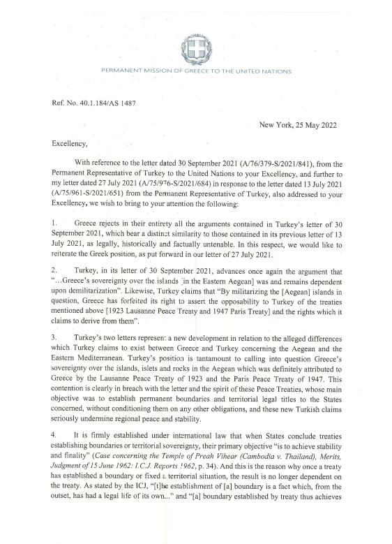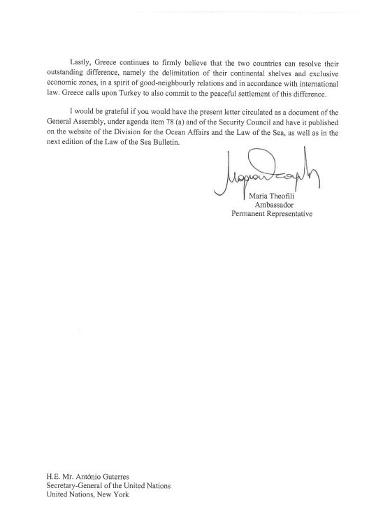 Η επιστολή καταλήγει λέγοντας ότι η Ελλάδα καλεί την Τουρκία να σταματήσει να αμφισβητεί την κυριαρχία επί των νησιών του Αιγαίου, να απέχει από την απειλή χρήσης βίας, παραβιάζοντας έτσι το άρθρο 2(4) του Χάρτη ου ΟΗΕ, και να σταματήσει να πραγματοποιεί παράνομες ενέργειες, οι οποίες παραβιάζουν την κυριαρχία και τα κυριαρχικά δικαιώματα της Ελλάδας στο Αιγαίο και στην Ανατολική Μεσόγειο.
