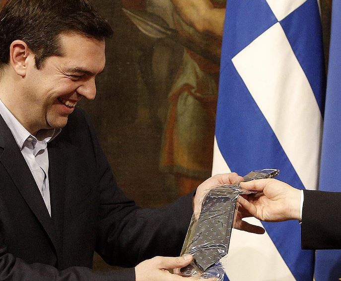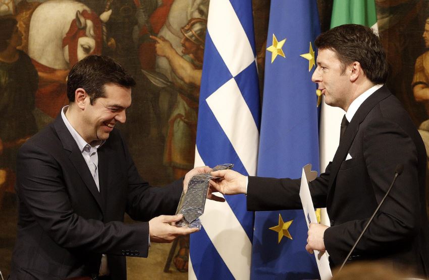 Μετά το τέλος των δηλώσεων τους, οι Πρωθυπουργοί της Ελλάδας και της Ιταλίας αντάλλαξαν μεταξύ τους δώρα με τον Ματέο Ρέντσι να δίνει στον Αλέξη Τσίπρα μία… γραβάτα γνωστού ιταλικού οίκου μόδας.