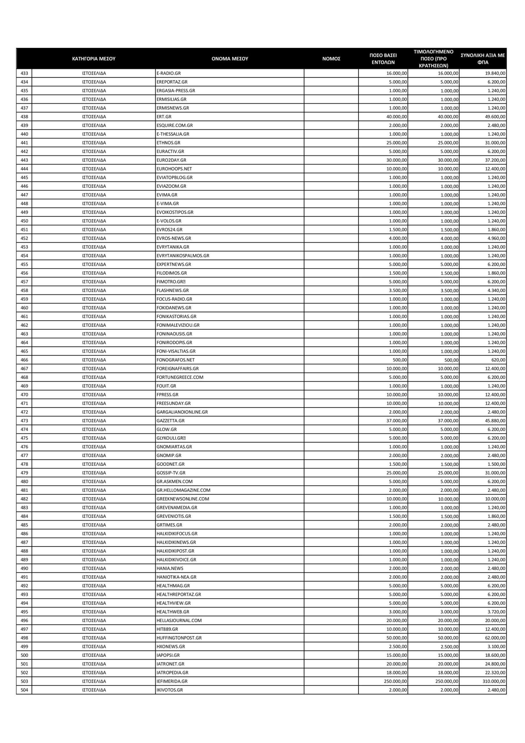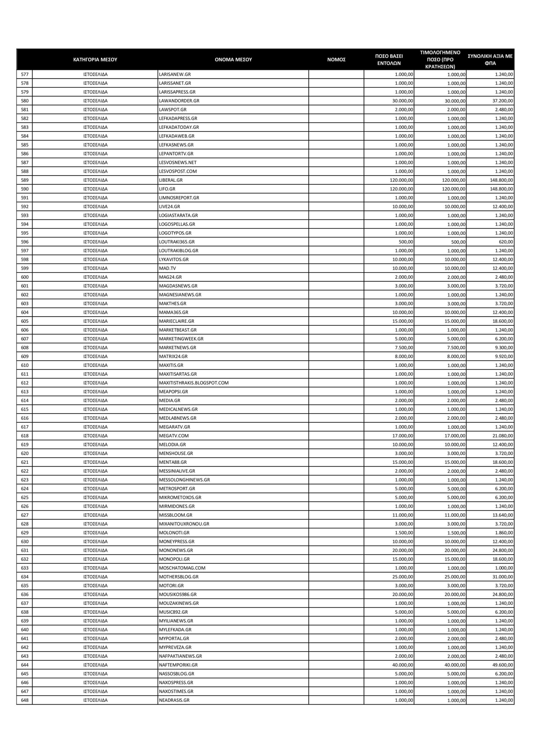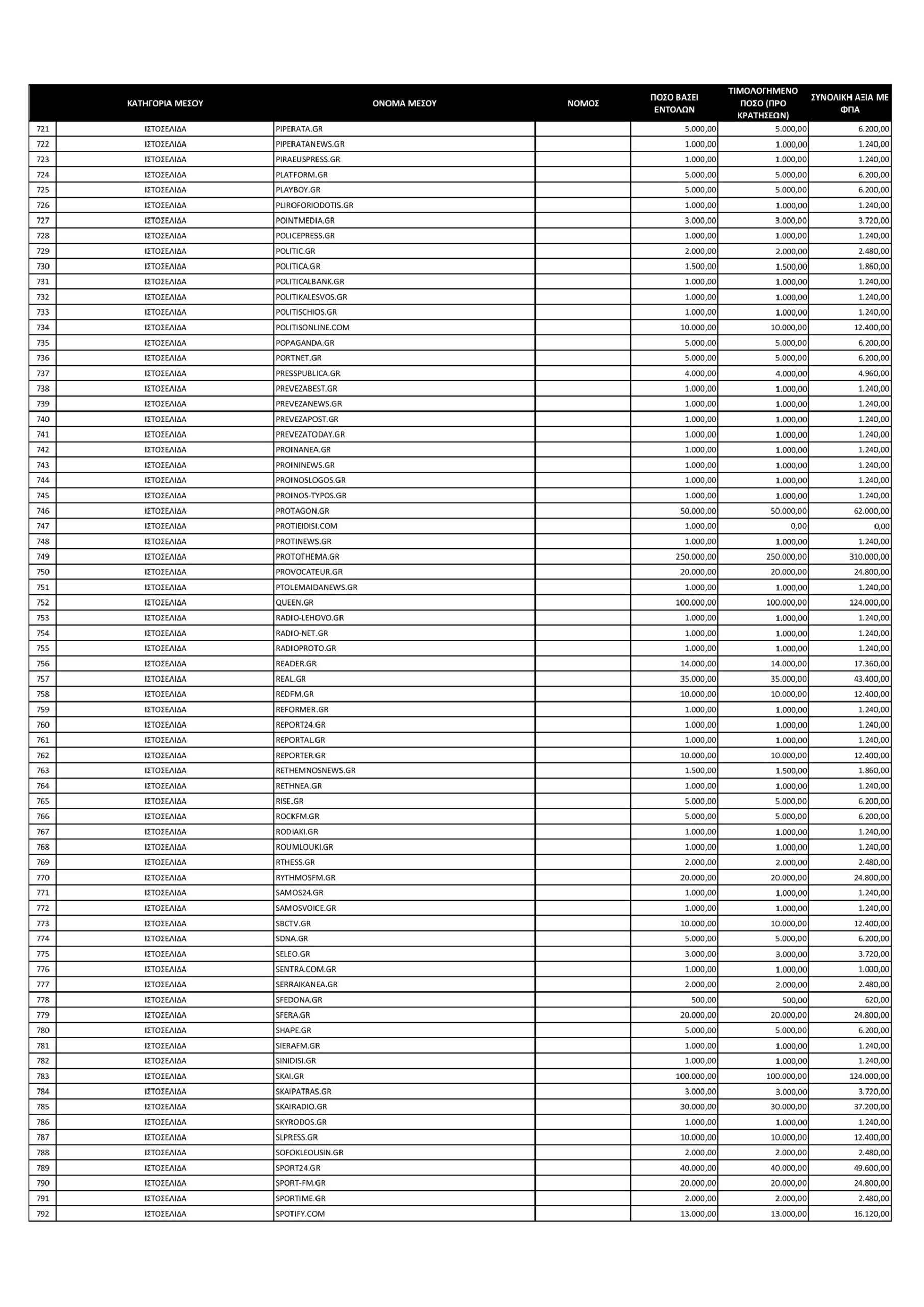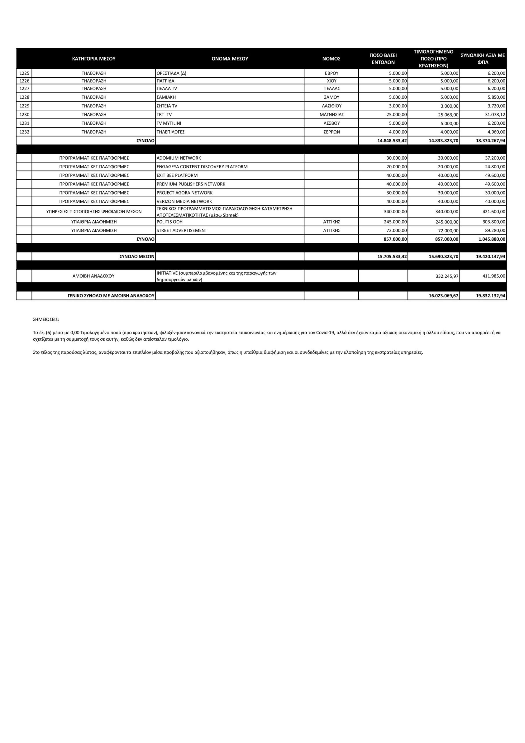 Δόθηκε στη δημοσιότητα το μεσημέρι της Δευτέρας από τον κυβερνητικό εκπρόσωπο Στέλιο Πέτσα ολόκληρη η λίστα με τα χρήματα που δόθηκαν σε Μέσα Μαζικής Ενημέρωσης για την καμπάνια ενημέρωσης για τον κορονοϊό. Στο τέλος της 18σελιδης λίστας αναφέρεται ότι τα έξι μέσα που περιλαμβάνονται στον κατάλογο με μηδενικό τιμολογημένο ποσό φιλοξένησαν κανονικά την εκστρατεία επικοινωνίας και ενημέρωσης για τον Covid-19, αλλά δεν έχουν καμία αξίωση οικονομική ή άλλου είδους, που να απορρέει ή να σχετίζεται με τη συμμετοχή τους σε αυτήν, καθώς δεν απέστειλαν τιμολόγιο. Στο τέλος της λίστας, αναφέρονται τα επιπλέον μέσα προβολής που αξιοποιήθηκαν, όπως η υπαίθρια διαφήμιση και οι συνδεδεμένες με την υλοποίηση της εκστρατείας υπηρεσίες.