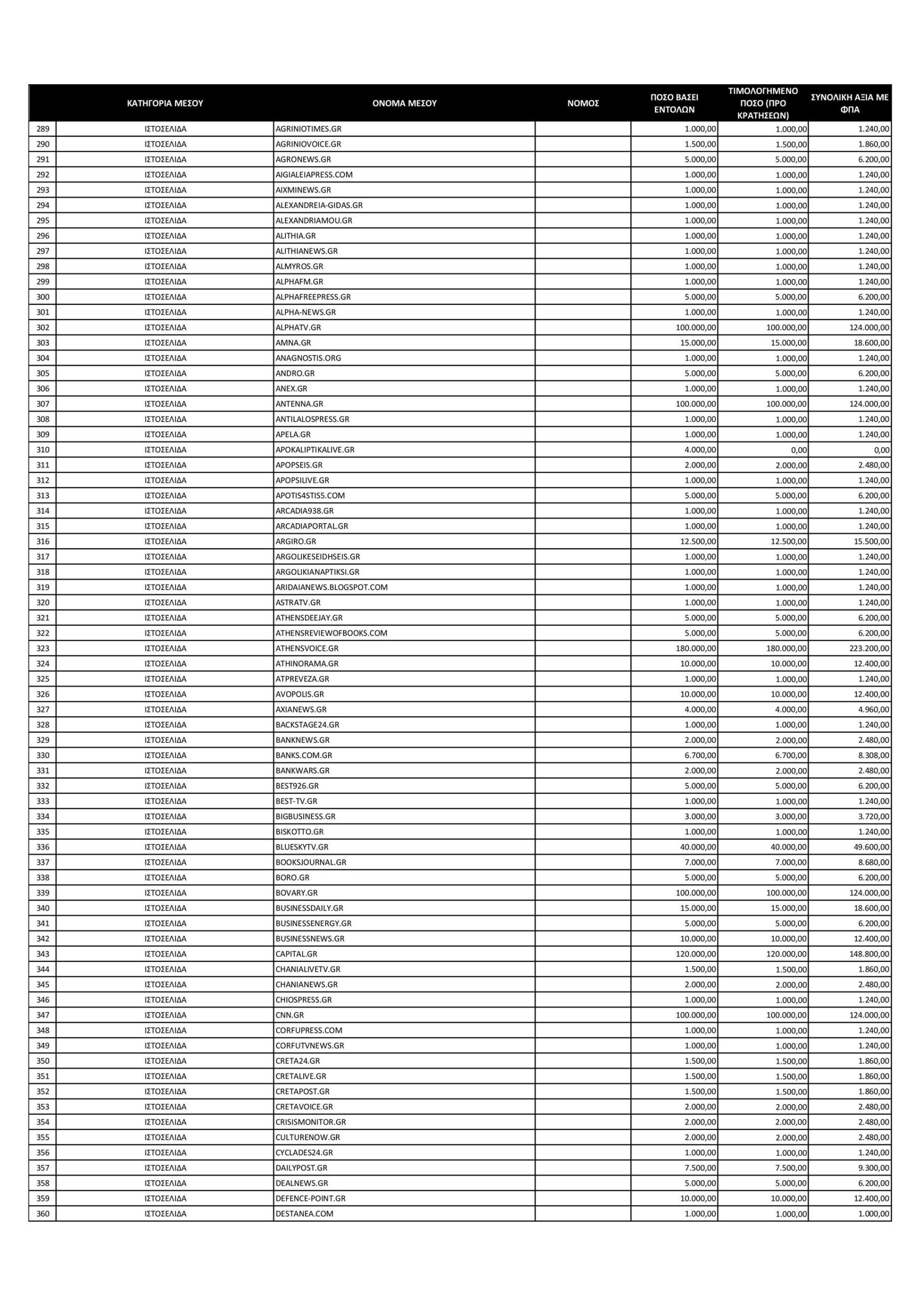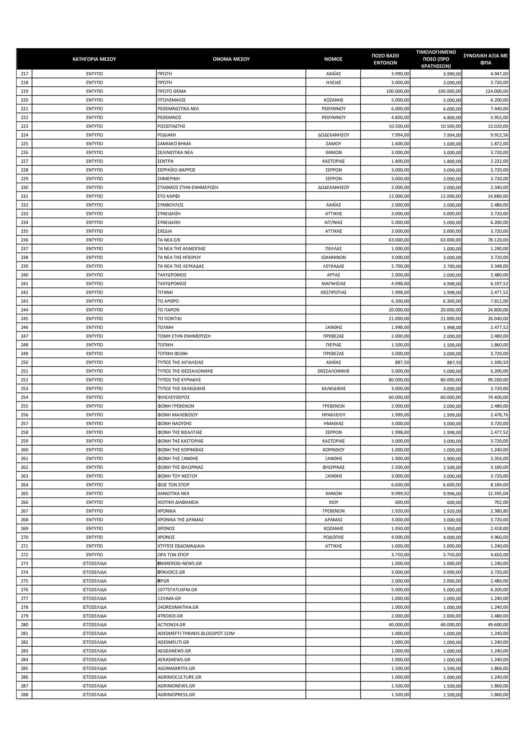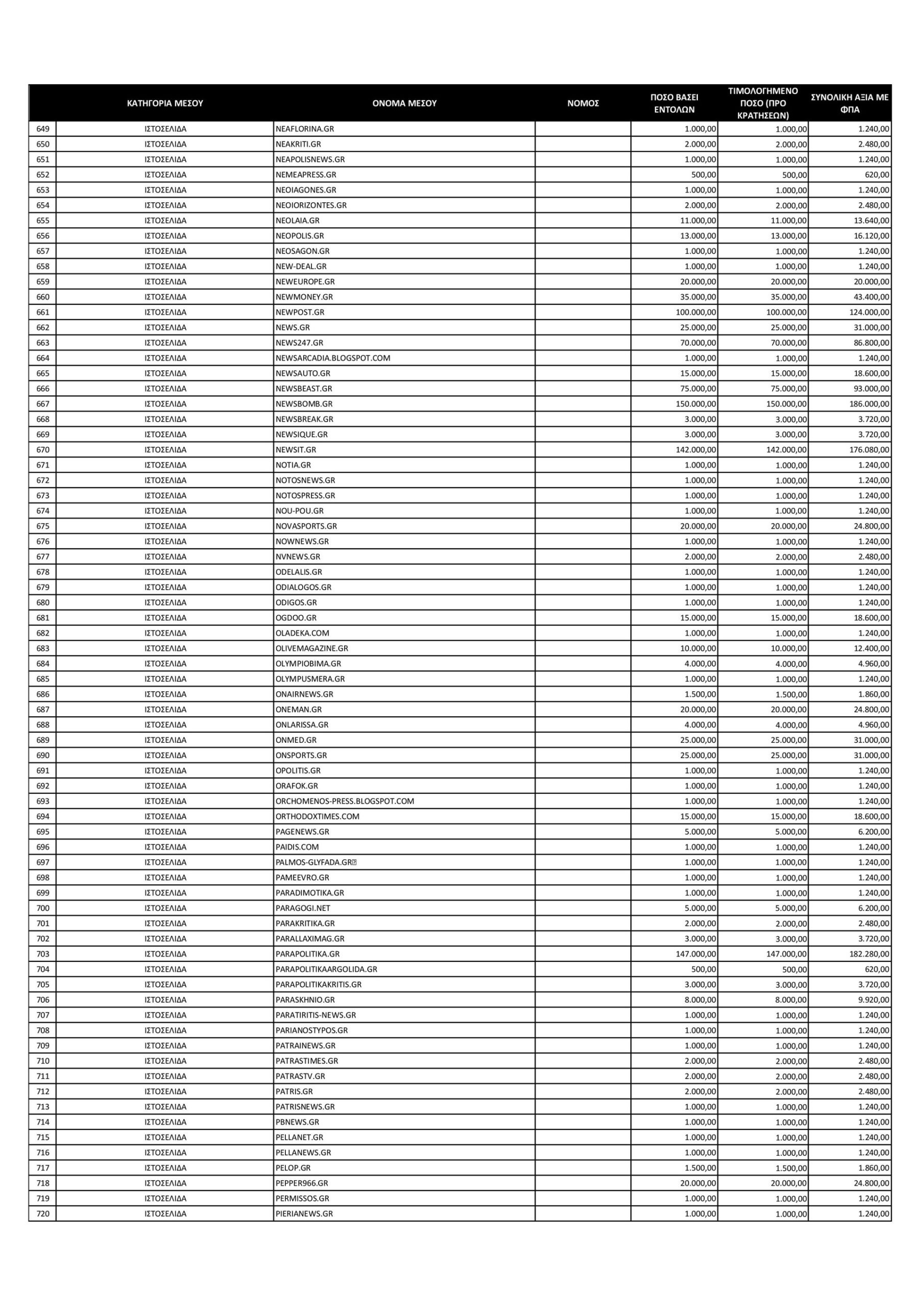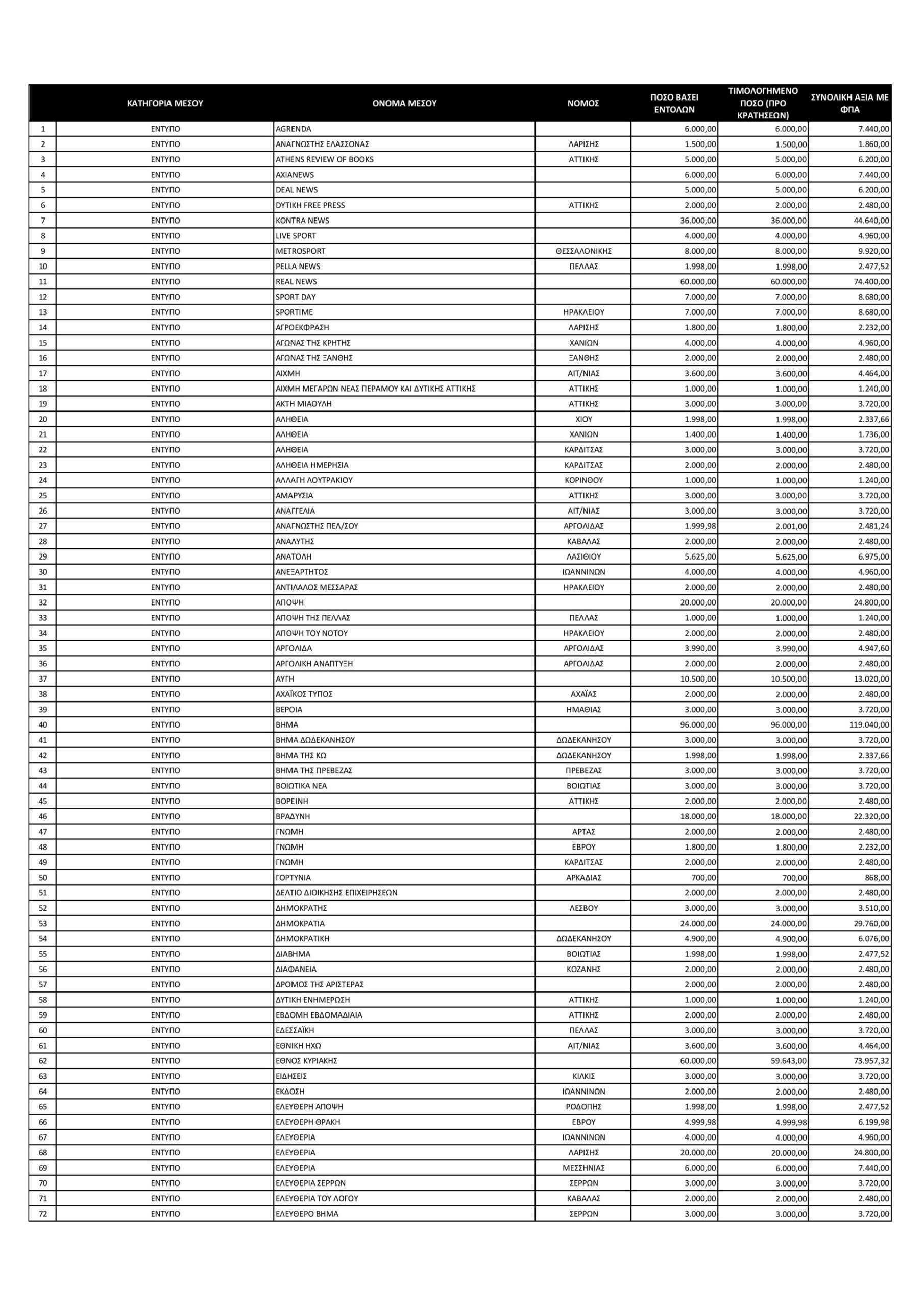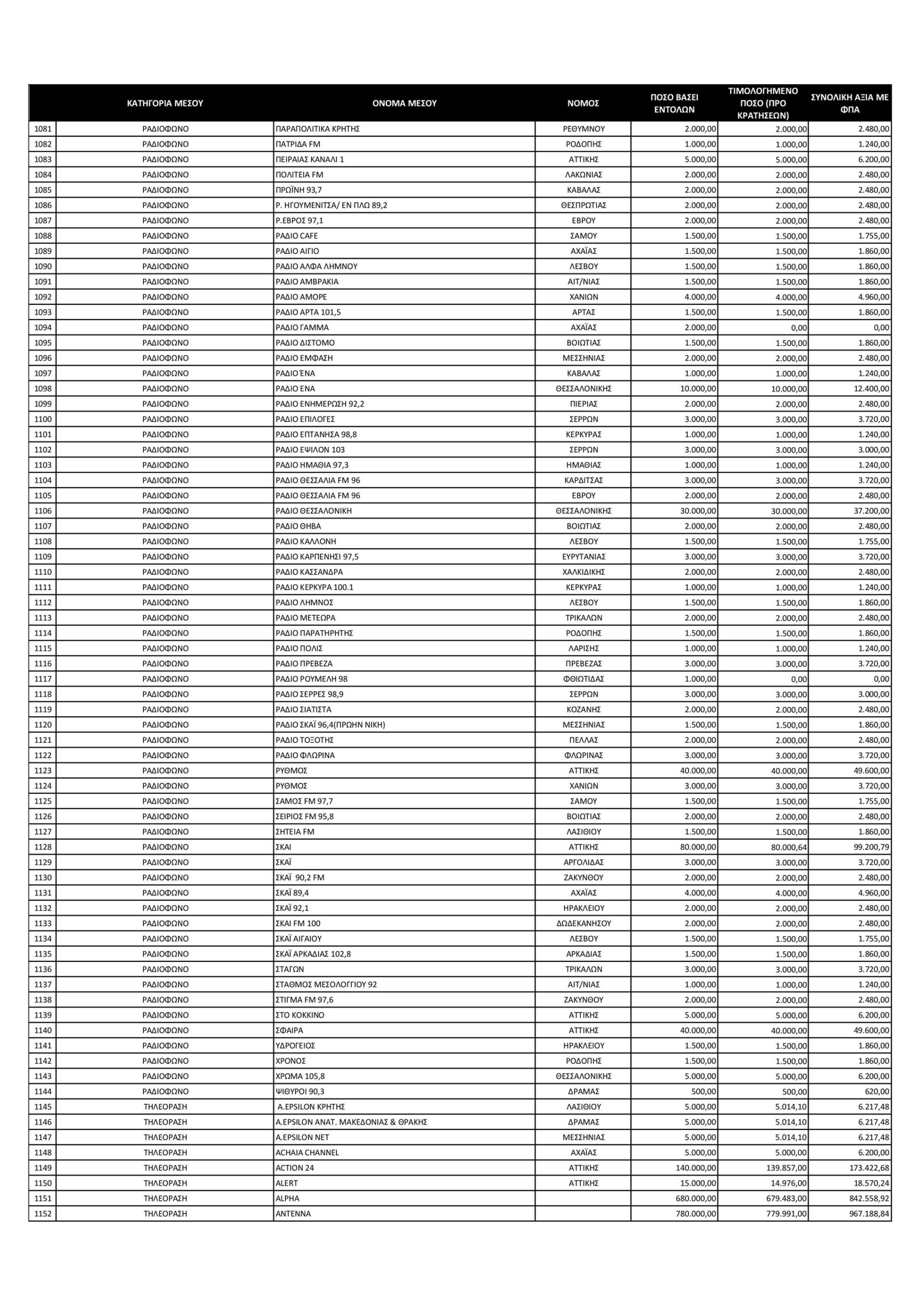 Δόθηκε στη δημοσιότητα το μεσημέρι της Δευτέρας από τον κυβερνητικό εκπρόσωπο Στέλιο Πέτσα ολόκληρη η λίστα με τα χρήματα που δόθηκαν σε Μέσα Μαζικής Ενημέρωσης για την καμπάνια ενημέρωσης για τον κορονοϊό. Στο τέλος της 18σελιδης λίστας αναφέρεται ότι τα έξι μέσα που περιλαμβάνονται στον κατάλογο με μηδενικό τιμολογημένο ποσό φιλοξένησαν κανονικά την εκστρατεία επικοινωνίας και ενημέρωσης για τον Covid-19, αλλά δεν έχουν καμία αξίωση οικονομική ή άλλου είδους, που να απορρέει ή να σχετίζεται με τη συμμετοχή τους σε αυτήν, καθώς δεν απέστειλαν τιμολόγιο. Στο τέλος της λίστας, αναφέρονται τα επιπλέον μέσα προβολής που αξιοποιήθηκαν, όπως η υπαίθρια διαφήμιση και οι συνδεδεμένες με την υλοποίηση της εκστρατείας υπηρεσίες.
