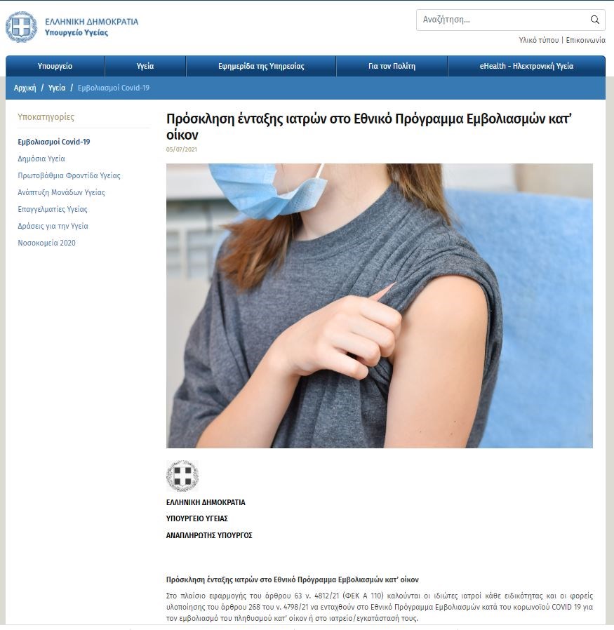 Τα ονόματα ή και οι επωνυμίες των συμβεβλημένων ιατρών και φορέων του άρθρου 268 ν. 4798/21, καθώς όλα τα στοιχεία επικοινωνίας τους αναρτώνται δυναμικά στον ιστότοπο emvolio.gov.gr προκειμένου οι πολίτες να επικοινωνούν μαζί τους για να ορίσουν την ημερομηνία εμβολιασμού τους.