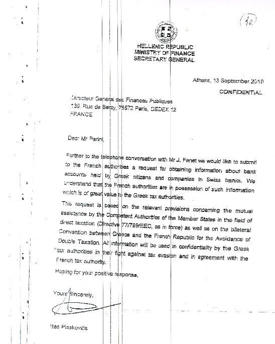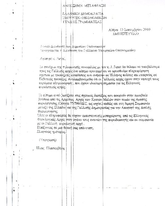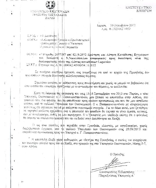 Έγγραφο που αποδεικνύει ότι την αλληλογραφία με τις γαλλικές αρχές για την έλευση της λίστας Λαγκάρντ στην Ελλάδα είχε ο ΓΓ του υπουργείου Οικονομικών Ηλίας Πλασκοβίτης και όχι ο ίδιος, κατέθεσε στην προκαταρκτική επιτροπή της Βουλής που ερευνά την υπόθεση της λίστας Λαγκάρντ, ο πρέσβης της Ελλάδας στο Παρίσι Κωνσταντίνος Χαλαστάνης.