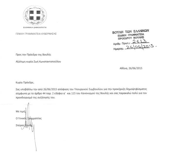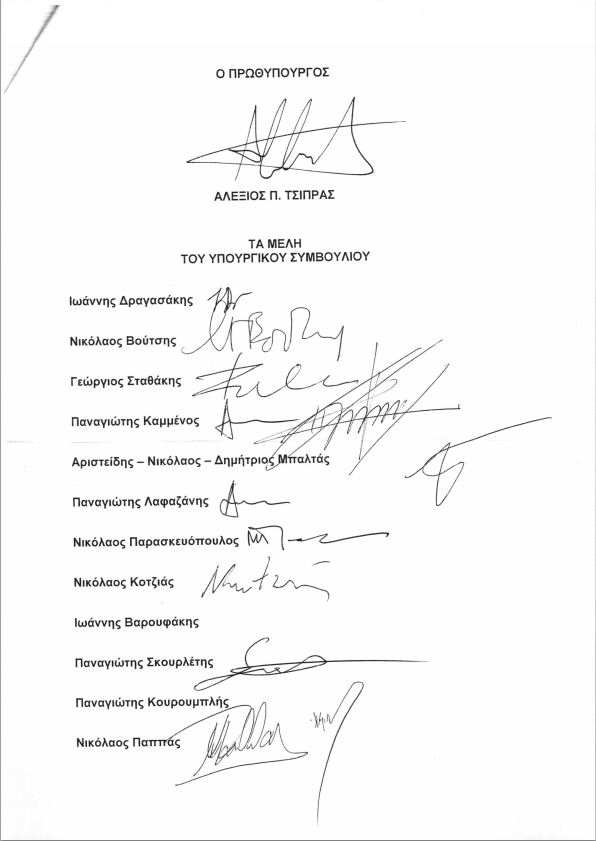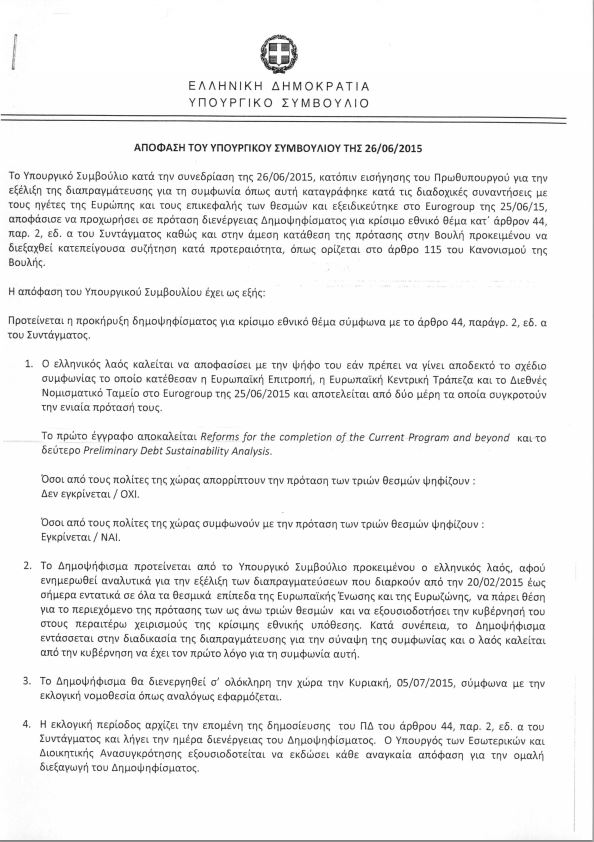Στην ιστοσελίδα της Βουλής αναρτήθηκε και η απόφαση του Υπουργικού Συμβουλίου για την διεξαγωγή του δημοψηφίσματος την οποία υπογράφει ο Πρωθυπουργός και μέλη του Υπουργικού Συμβουλίου.