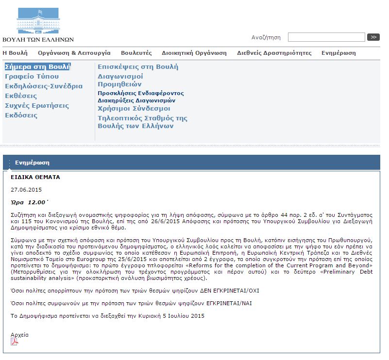 Στην ιστοσελίδα της Βουλής αναρτήθηκε το κείμενο που αφορά τη διενέργεια δημοψηφίσματος.