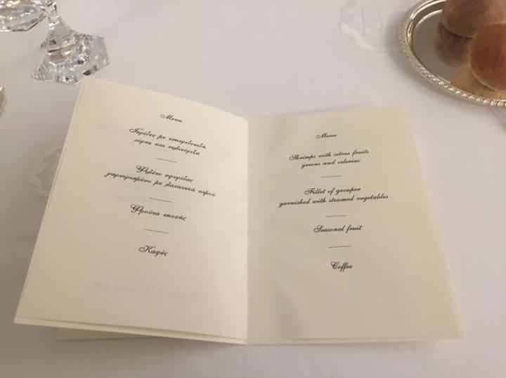 Το δείπνο λοιπόν περιλαμβάνει γαρίδες με εσπεριδοειδή, χόρτα με σελινόριζα ,φιλέτο σφυρίδα γαρνιρισμένο με λαχανικά ατμού, φρούτα εποχής και καφέ.
