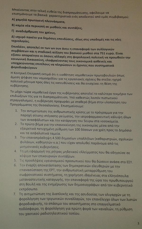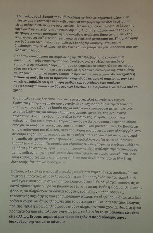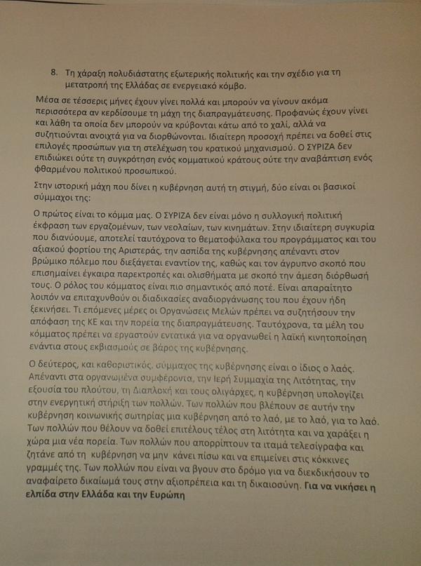Στο σχέδιο απόφασης, σύμφωνα με το Αθηναϊκό-Μακεδονικό Πρακτορείο Ειδήσεων, αναφέρεται ότι αντίπαλοι της συνοχής των ευρωπαϊκών λαών είναι οι φανατικοί της λιτότητας που υπονομεύουν την διαδικασία της διαπραγμάτευσης, υιοθετώντας αδιάλλακτες θέσεις και επιχειρώντας τον πιστωτικό στραγγαλισμό της ελληνικής οικονομίας και υπογραμμίζεται πως «όσοι πιστεύουν ότι θα ταπεινώσουν την Ελλάδα, παίζουν παιχνίδι με την φωτιά». Επίσης αναφέρει ότι «αν συνεχιστεί η πιστωτική ασφυξία και τα πράγματα οδηγηθούν σε οριακό σημείο, ας μην έχει κανείς αμφιβολία, ότι η πληρωμή μισθών και συντάξεων έχει απόλυτη προτεραιότητα έναντι των δόσεων και των δανείων».