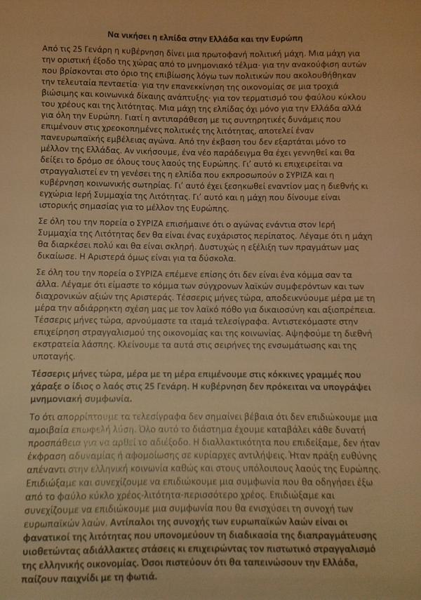 Στο σχέδιο απόφασης τονίζεται ότι «η κυβέρνηση δεν πρόκειται να υπογράψει μνημονιακή συμφωνία» και επισημαίνεται ότι τέσσερις μήνες τώρα « αρνούμαστε τα ιταμά τελεσίγραφα». Ωστόσο, σημειώνεται στο σχέδιο απόφασης, το ότι η κυβέρνηση απορρίπτει τα τελεσίγραφα, δεν σημαίνει ότι δεν επιδιώκει μια αμοιβαία επωφελή λύση και προσθέτει ότι η κυβέρνηση όλο αυτό το διάστημα έχει καταβάλλει κάθε δυνατή προσπάθεια για να αρθεί το αδιέξοδο.