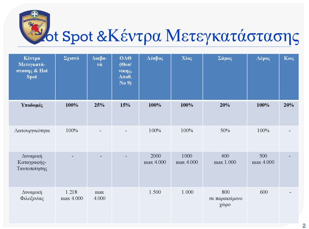 Η ολοκλήρωση της κατασκευής και λειτουργίας των Hot Spot και Κέντρων Μετεγκατάστασης, στοχεύει στην καταγραφή και ταυτοποίηση των προσφύγων και μεταναστών ώστε η προώθηση προς την Ευρώπη και προς τις χώρες τους αντίστοιχα να γίνεται ταχύτατα και στη βάση Ευρωπαϊκών και διεθνών συνθηκών για την ασφάλεια και τα ανθρώπινα δικαιώματα».