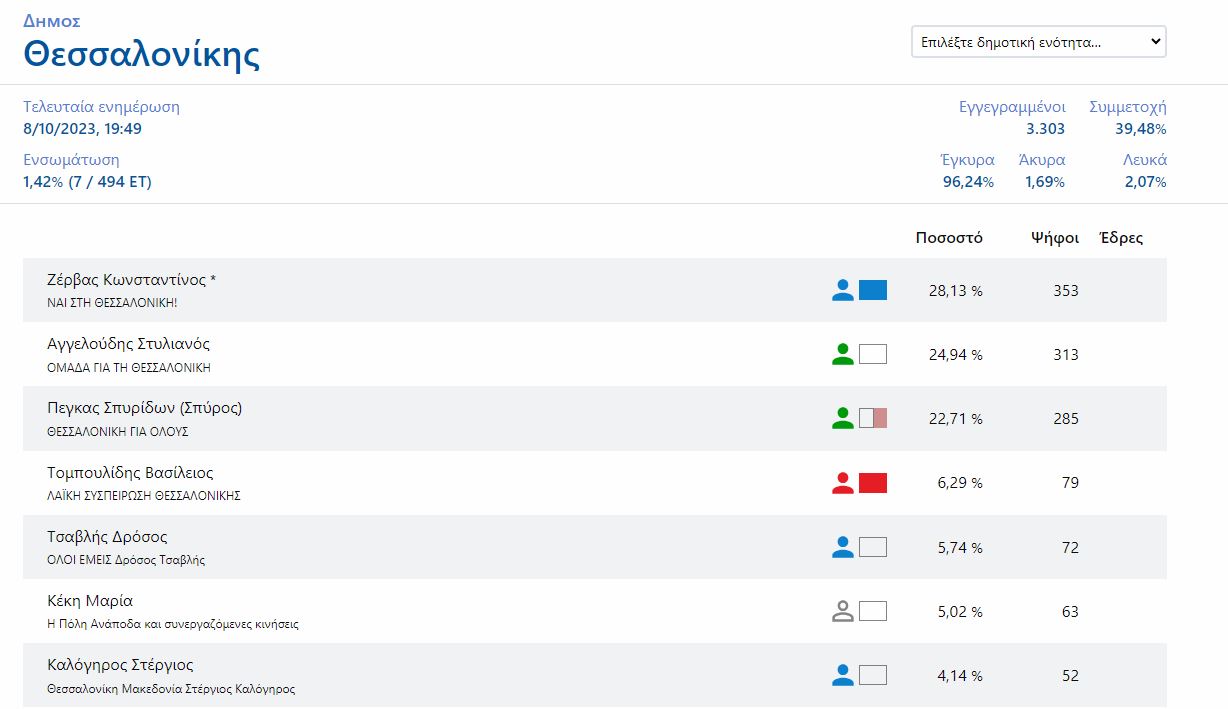 Στο 28,13% φτάνει το ποσοστό του Κωνσταντίνου Ζέρβα στις αυτοδιοικητικές εκλογές για τον Δήμο Θεσσαλονίκης με ενσωμάτωση στο 1,42%. Ακολουθεί ο Στυλιανός Αγγελούδης με 24,94%.