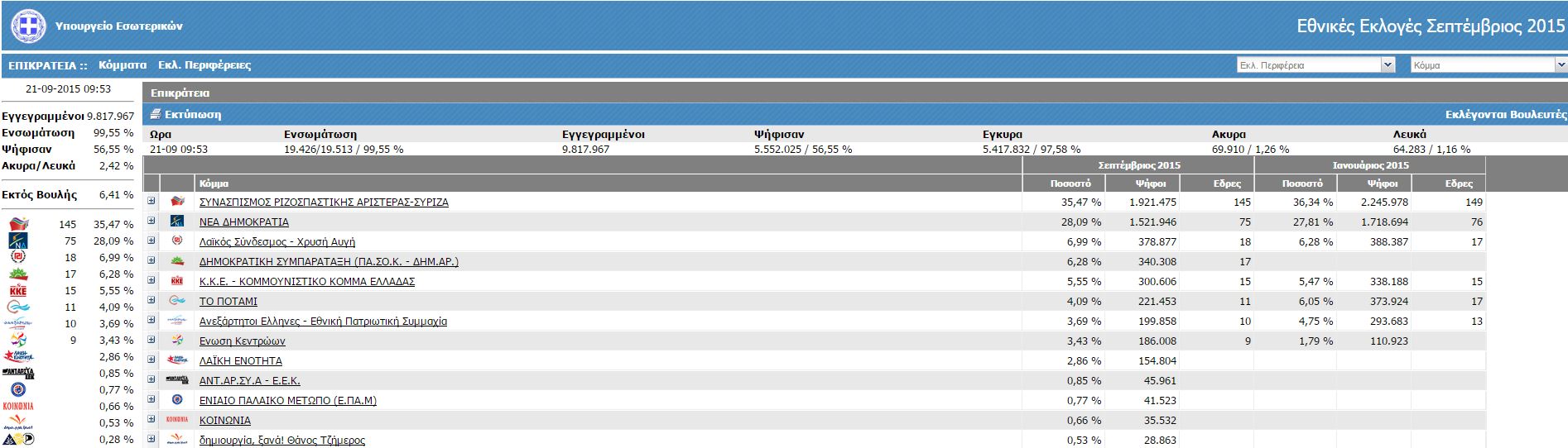 Ο ΣΥΡΙΖΑ είναι ο νικητής των βουλευτικών εκλογών της 20ης Σεπτεμβρίου συγκεντρώνοντας ποσοστό 35,47%, με καταγεγραμμένο ποσοστό ενσωμάτωσης 99,50%, ενώ δεύτερο κόμμα εξελέγη η Ν.Δ, η οποία ακολουθεί με 28,09%.