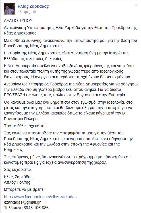 «Με αίσθημα ευθύνης, ανακοινώνω την υποψηφιότητα μου για την θέση του Προέδρου της Νέας Δημοκρατίας», αναφέρει ο Ηλίας Ζαρκάδας στο Facebook και συνεχίζει: