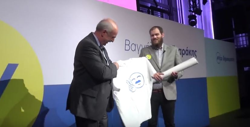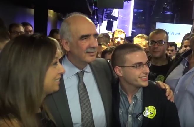 Ένα χαμογελαστό πρόσωπο με …μουστάκι που σχηματίζει με το χέρι του το σήμα της νίκης ήταν αποτυπωμένο στα αυτοκόλλητα που φορούσαν νέες και νέοι στην ομιλία του υποψηφίου προέδρου της ΝΔ, Ευάγγελου Μεϊμαράκη, χθες στο Γκάζι.