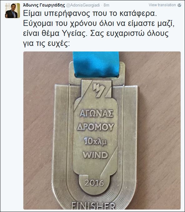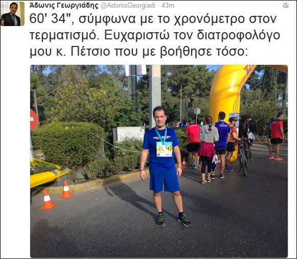 Ο Άδωνις Γεωργιάδης τερμάτισε πριν από λίγο στο δρόμο των 10 χιλιομέτρων στον Μαραθώνιο της Αθήνας. Με ανάρτησή του στο Twitter ανέφερε ότι ο χρόνος του ήταν 1 ώρα και 34 δευτερόλεπτα. Επίσης ο αντιπρόεδρος της Νέας Δημοκρατίας ανέβασε φωτογραφία με το μετάλλιο που πήρε για την συμμετοχή του και παράλληλα έγραψε: “Είμαι υπερήφανος που το κατάφερα. Εύχομαι του χρόνου όλοι να είμαστε μαζί, είναι θέμα υγείας. Σας ευχαριστώ όλους για τις ευχές”.