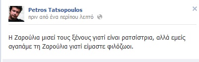 “Η Ζαρούλια μισεί τους ξένους γιατί είναι ρατσίστρια, αλά εμείς αγαπάμε τη Ζαρούλια γιατί είμαστε φιλόζωοι”, έγραψε ο Πέτρος Τατσόπολος.