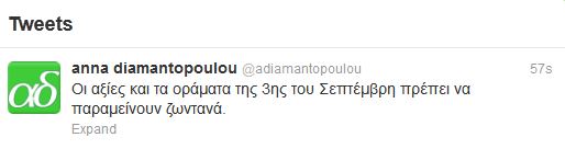 Την μεγάλη εκδήλωση του ΠΑΣΟΚ για την επέτειο της ιδρυτικής διακήρυξης της 3η Σεπτέμβρη, σχολιάσε μέσω Twitter η Άννα Διαμαντοπούλου.”Οι αξίες και τα οράματα της 3ης του Σεπτέμβρη πρέπει να παραμείνουν ζωντανά”, έγραψε πριν από λίγο.