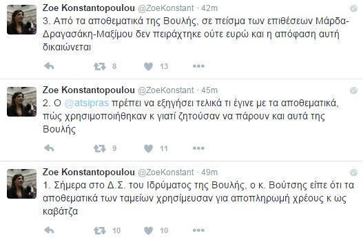 Αιχμές κατά της Κυβέρνησης για τα αποθεματικά των ταμείων και της Βουλής αφήνει η πρώην Πρόεδρος της Βουλής, Ζωή Κωνσταντοπούλου μέσω αναρτήσεων της στο twitter. Η κ. Κωνατντοπούλου σημειώνει:
