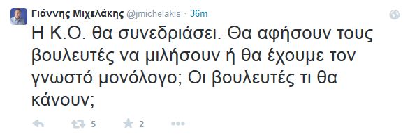 «Η Κ.Ο. θα συνεδριάσει. Θα αφήσουν τους βουλευτές να μιλήσουν ή θα έχουμε τον γνωστό μονόλογο; Οι βουλευτές τι θα κάνουν;», αναφέρει στο «τιτίβισμά» του ο «γαλάζιος» βουλευτής.