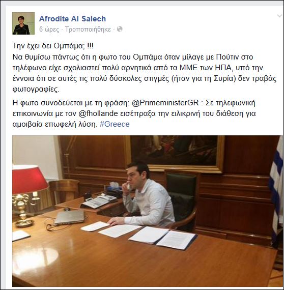 Με ένα αιχμηρό σχόλιο στο Facebook σχολίασε η Αφροδίτη Αλ Σάλεχ τη φωτογραφία που ανέβασε στο Twitter ο Αλέξης Τσίπρας από την τηλεφωνική του επικοινωνία με τον Γάλλο Προέδρο Φρανσουά Ολάντ.