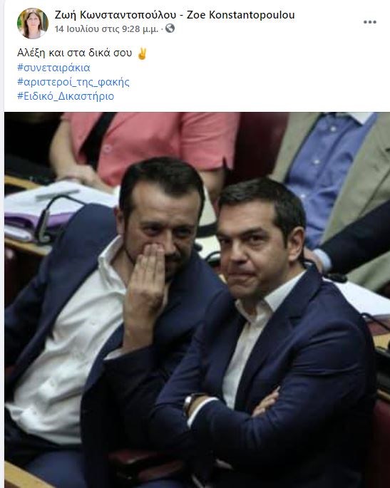 Με μία φωτογραφία, που απεικονίζει τον Αλέξη Τσίπρα και τον Νίκο Παππά, η Ζωή Κωνσταντοπούλου έστειλε μήνυμα στον πρόεδρο του ΣΥΡΙΖΑ-Προοδευτική Συμμαχία. Μετά την παραπομπή του Νίκου Παππά στο Ειδικό Δικαστήριο για το αδίκημα της παράβασης καθήκοντος, η επικεφαλής της Πλεύσης Ελευθερίας, έκανε μια αιχμηρή ανάρτηση στο Facebook γράφοντας: “Αλέξη και στα δικά σου”. Συμπλήρωσε, δε, την ανάρτησή της με τρία hashtag: “συνεταιράκια”, “αριστεροί της φακής” και “ειδικό δικαστήριο”.