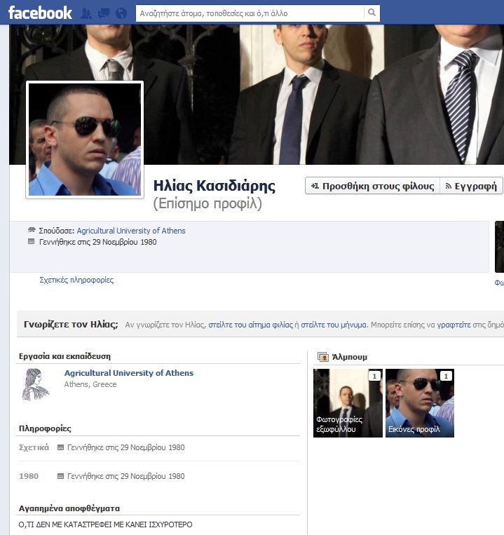 Το παλιό προφίλ του Ηλία Κασιδιάρη στο Facebook δεν υπάρχει. Ο βουλευτής της Χρυσής Αυγής μέσω Twitter ανακοίνωσε το νέο επίσημο προφίλ του στο Facebook, πριν από μερικές ώρες.Προς το παρόν δεν έχει κάνει κάποια ανάρτηση, παρά μόνο έχει ανεβάσει δύο φωτογραφίες. Ο ίδιος αναφέρει ως αγαπημένο του απόφθεγμα τη φράση “Ό,τι δεν με καταστρέφει, με κάνει ισχυρότερο”.Σημειώνεται ότι πριν από 1,5 μήνα, στις 10 Αυγούστου, ο Ηλίας Κασιδιάρης,μέσω Twitter, είχε και πάλι ανακοινώσει το νέο του-αλλά παλιό πλέον- προφίλ στο Facebook.
