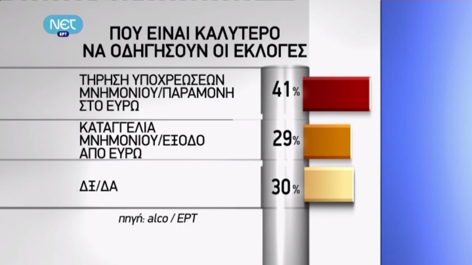 Επίσης, το 41% των ερωτηθέντων απαντά ότι είναι καλύτερο οι εκλογές να οδηγήσουν στην τήρηση υποχρεώσεων του μνημονίου και στην παραμονή στο ευρώ, με το 29% να δηλώνει ότι οι εκλογές πρέπει να οδηγήσουν στην καταγγελία του μνημονίου και στην έξοδο από το ευρώ.