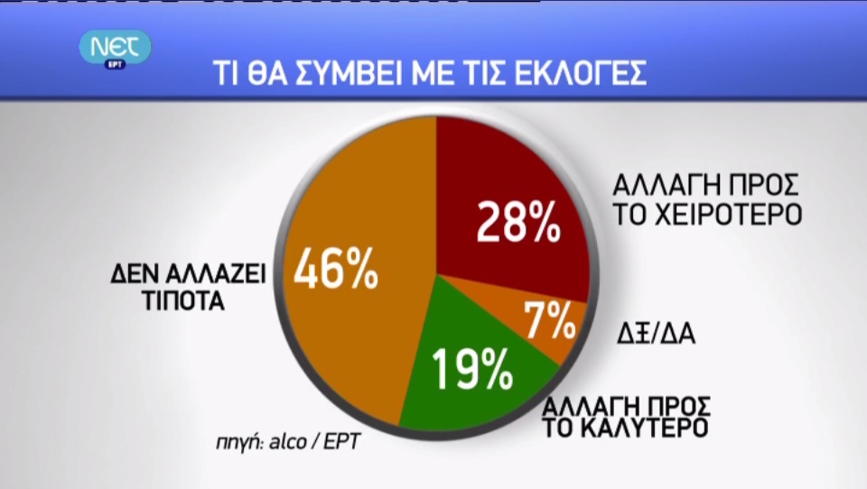 Απογοήτευση και οργή για την πολιτική νιώθουν 9 στους δέκα ψηφοφόρους, σύμφωνα με έρευνα της Alco για τη ΝΕΤ. Την ίδια στιγμή περίπου οι μισοί πιστεύουν ότι δεν θα αλλάξει τίποτα με τις εκλογές.Συγκεκριμένα, σύμφωνα με την έρευνα το 52% των ερωτηθέντων νιώθει απογοήτευση για την πολιτική και το 40% οργή. Το 6% απαντά ότι το κυρίαρχο συναίσθημά του για την πολιτική είναι η προσδοκία, ενώ μόλις το 1% η ικανοποίηση. Παράλληλα, το 46% πιστεύει ότι δεν θα αλλάξει τίποτα με τις εκλογές, το 28% θεωρεί πως οι εκλογές θα φέρουν αλλαγή προς το χειρότερο, ενώ μόνο το 19% θεωρεί πως θα επέλθει αλλαγή προς το καλύτερο.