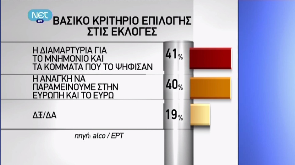 Αντίστοιχα, για το 41% των ψηφοφόρων βασικό κριτήριο επιλογής στις εκλογές θα αποτελέσει η διαμαρτυρία για το μνημόνιο και τα κόμματα που το ψήφισαν, ενώ για το 40% η ανάγκη να παραμείνουμε στην Ευρώπη και το ευρώ.