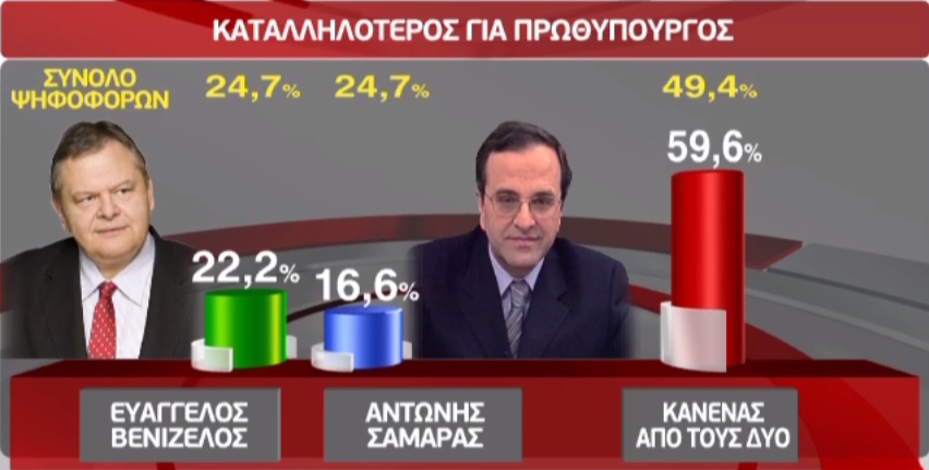 Χαμηλά ποσοστά συγκεντρώνουν τα δύο μεγάλα κόμματα σύμφωνα με δημοσκόπηση της GPO για το MEGA, ενώ το ποσοστό των αναποφάσιστων φτάνει το 18%! Το ποσοστό μάλιστα των αναποφάσιστων είναι κατά 9 μονάδες μεγαλύτερο σε σχέση με τις εκλογές του 2009.Συγκεκριμένα, η διαφορά μεταξύ ΝΔ και ΠΑΣΟΚ είναι στο 4,6%, και η βουλή που ενδέχεται να προκύψει σύμφωνα με τη δημοσκόπηση είναι οχτακομματική.Έτσι, η ΝΔ συγκεντρώνει 19,1% και το ΠΑΣΟΚ 14,5%. Ακολουθεί το ΚΚΕ 8%. το ΣΥΡΙΖΑ σε 7,3%, σε απόσταση αναπνοής οι Ανεξάρτητοι Έλληνες με 7,2 %, η Δημοκρατική Αριστερά με 5,9%, η Χρυσή Αυγή με 4,1%, το ΛΑ.Ο.Σ. με 3,5%, ενώ η Δημοκρατική Συμμαχία μένει εκτός βουλής σύμφωνα με τη δημοσκόπηση. Παρά το σαφές προβάδισμα της ΝΔ, σε ότι αφορά το ποιος είναι καταλληλότερος για πρωθυπουργός, προηγείται ο Ευάγγελος Βενιζέλος 22,2% και Αντώνης Σαμαράς με 16,6%. Χαρακτηριστικό είναι όμως ότι το 59,6% απαντά ότι κανένας δεν είναι καταλληλότερος για πρωθυπουργός.