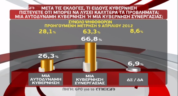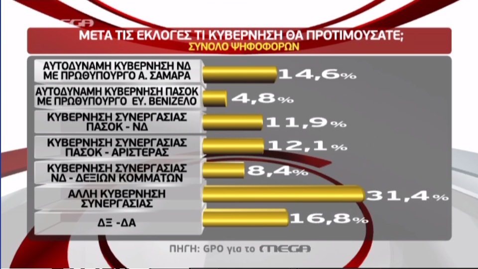Την ίδια στιγμή, στο ερώτημα “τι κυβέρνηση θα προτιμούσατε μετά τις εκλογές” το 14,6% απαντά ότι επιθυμεί αυτοδύναμη κυβέρνηση ΝΔ με πρωθυπουργό τον Αντώνη Σαμαρά, το 12,1% κυβέρνησης επιθυμεί κυβέρνηση συνεργασίας ΠΑΣΟΚ-Αριστεράς, το 11,9% κυβέρνηση συνεργασίας ΠΑΣΟΚ-ΝΔ και μόλις το 4,8% επιθυμεί αυτοδύναμη κυβέρνηση ΠΑΣΟΚ με πρωθυπουργό τον Ευάγγελο Βενιζέλο. Το 31,4% πάντως απαντά ότι θέλει άλλη κυβέρνηση συνεργασίας.