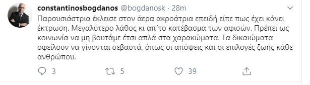Ο Κωνσταντίνος Μπογδάνος μέσω του προσωπικού λογαριασμού του στο twitter αναφέρθηκε σε περιστατικό που σημειώθηκε σε εκπομπή, δίχως να αναφερθεί σε ονόματα.«Παρουσιάστρια έκλεισε στον αέρα ακροάτρια επειδή είπε πως έχει κάνει έκτρωση», αναφέρει ο βουλευτής της Νέας Δημοκρατίας. Και προσθέτει, με αφορμή τον σάλο που δημιουργήθηκε με τις αφίσες για τις αμβλώσεις στο Μετρό: «Μεγαλύτερο λάθος κι από το κατέβασμα των αφισών. Πρέπει ως κοινωνία να μην βουτάμε έτσι απλά στα χαρακώματα». «Τα δικαιώματα οφείλουν να γίνονται σεβαστά, όπως οι απόψεις και οι επιλογές ζωής κάθε ανθρώπου», συμπληρώνει ο Κωνσταντίνος Μπογδάνος.