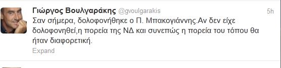 «Σαν σήμερα, δολοφονήθηκε ο Π. Μπακογιάννης. Αν δεν είχε δολοφονηθεί, η πορεία της ΝΔ και συνεπώς η πορεία του τόπου θα ήταν διαφορετική», σχολίασε νωρίτερα στον προσωπικό του λογαριασμό στο Twitter, ο Γιώργος Βουλγαράκης.
