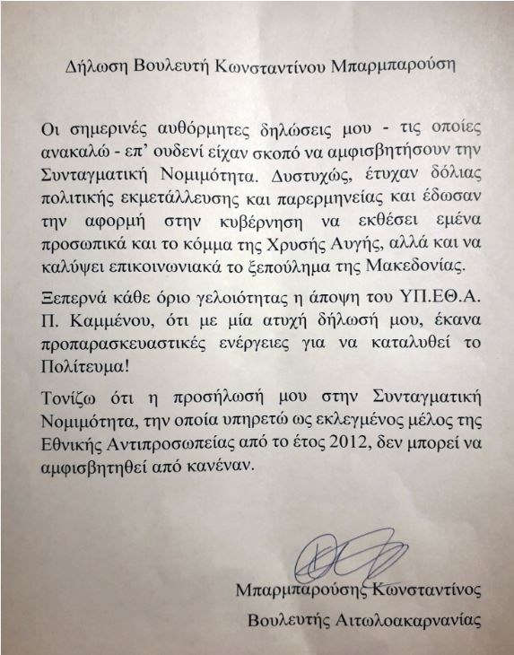 «Επ’ ουδενί είχαν σκοπό οι δηλώσεις μου να αμφισβητήσουν τη συνταγματική νομιμότητα» ισχυρίστηκε ο βουλευτής, επιχειρώντας να διαψεύσει εαυτόν αλλά και τους χιλιάδες πολίτες που άκουσαν όσα είπε από το βήμα της Βουλής.