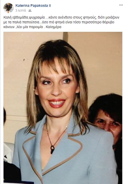 Μία ανάρτηση με… μπηχτές έκανε η ανεξάρτητη βουλευτής Κατερίνα Παπακώστα, καλημερίζοντας τους διαδικτυακούς της φίλους και ευχόμενη μία καλή και… ψύχραιμη εβδομάδα.