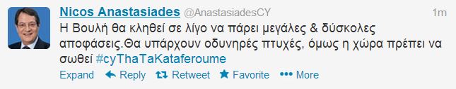 «Η Βουλή θα κληθεί σε λίγο να πάρει μεγάλες και δύσκολες αποφάσεις. Θα υπάρχουν οδυνηρές πτυχές, όμως η χώρα πρέπει να σωθεί», έγραψε ο Πρόεδρος της Κυπριακής Δημοκρατίας, Νίκος Αναστασιάδης στο twitter.