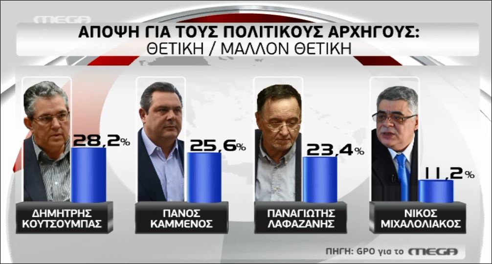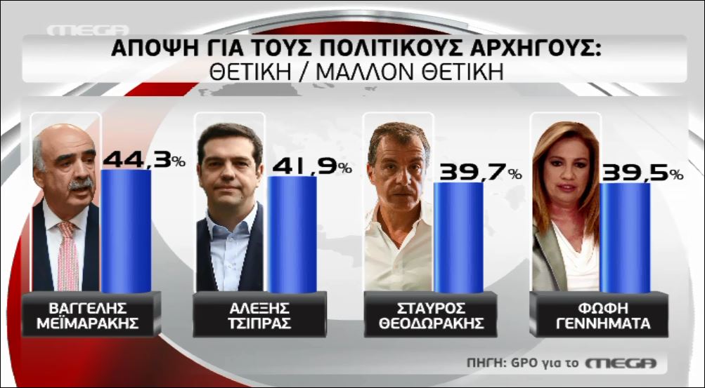 Όσον αφορά στη δημοτικότητα των πολιτικών αρχηγών, ο Βαγγέλης Μεϊμαράκης προηγείται συγκεντρώνοντας 44,3% σε θετικές γνώμες. Ακολουθεί ο Αλέξης Τσίπρας με 41,9%, ο Σταύρος Θεοδωράκης με 39,7%, η Φώφη Γεννηματά με 39,5%, ο Δημήτρης Κουτσούμπας με 28,2%, ο Πάνος Καμμένος με 25,6%, ο Παναγιώτης Λαφαζάνης με 23,4% και ο Νίκος Μιχαλολιάκος με 11,2%.