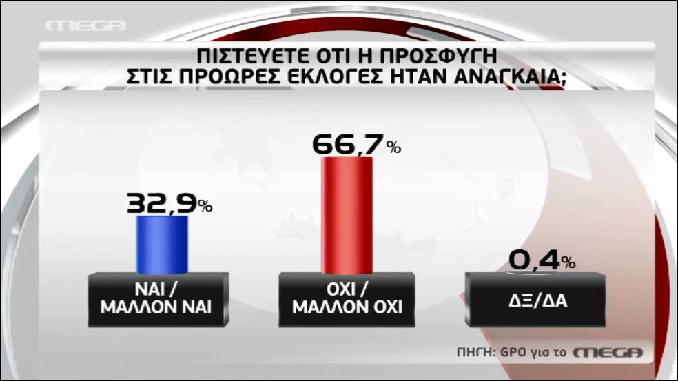 Στην ερώτηση «πιστεύετε ότι η προσφυγή στις πρόωρες εκλογές ήταν αναγκαία» το 66,7% απαντά όχι, μάλλον όχι και το 32,9 % ναι, μάλλον ναι.