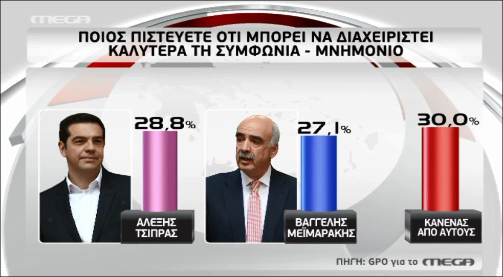 Στην ερώτηση «ποιος πιστεύετε ότι μπορεί να διαχειριστεί καλύτερα τη συμφωνία – μνημόνιο» το 28,8% απαντά ο Αλέξης Τσίπρας, το 27,1% ο Βαγγέλης Μεϊμαράκης και το 30% απαντά «κανένας».
