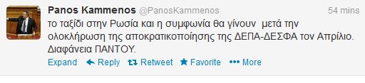 “Το ταξίδι στην Ρωσία και η συμφωνία θα γίνουν μετά την ολοκλήρωση της αποκρατικοποίησης της ΔΕΠΑ-ΔΕΣΦΑ τον Απρίλιο. Διαφάνεια ΠΑΝΤΟΥ”, έγραψε ο πρόεδρος Ανεξάρτητων Ελλήνων.