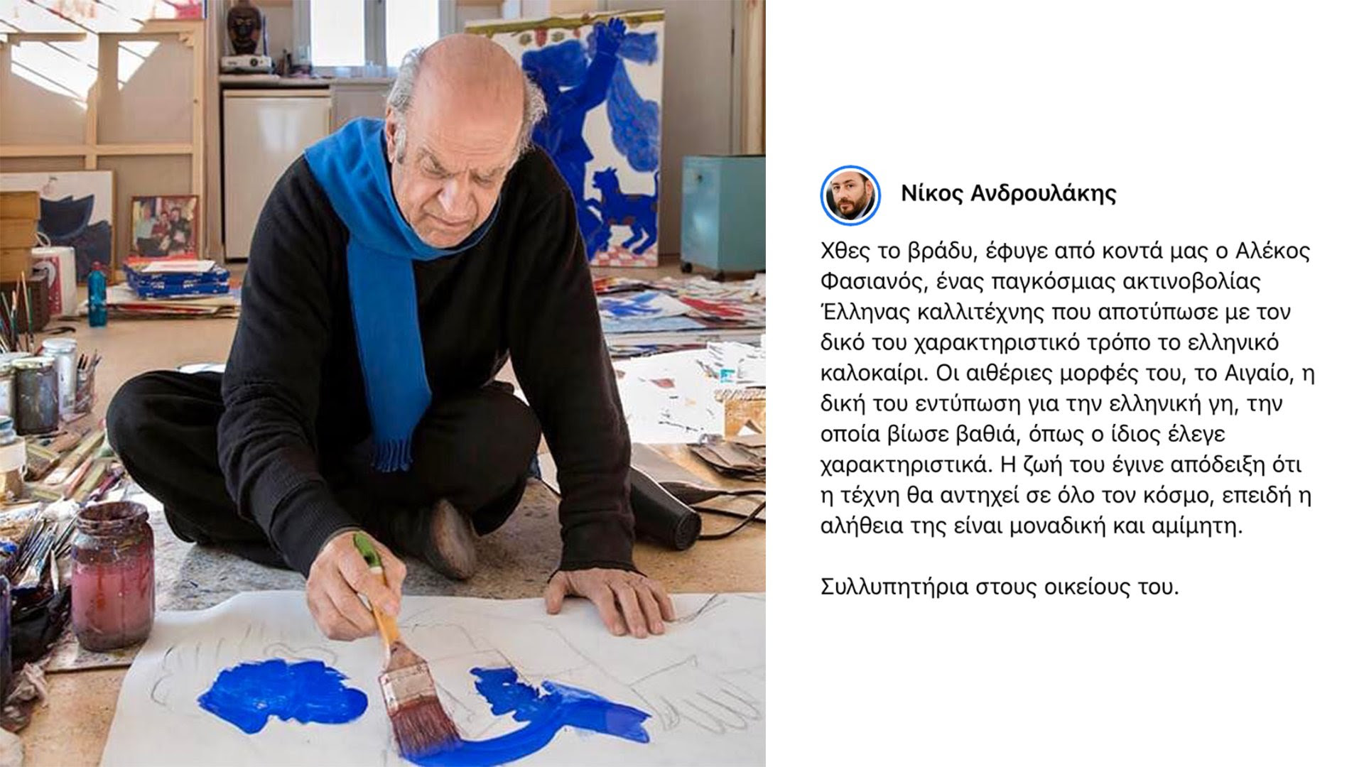 “Χθες το βράδυ, έφυγε από κοντά μας ο Αλέκος Φασιανός, ένας παγκόσμιας ακτινοβολίας Έλληνας καλλιτέχνης που αποτύπωσε με τον δικό του χαρακτηριστικό τρόπο το ελληνικό καλοκαίρι. Οι αιθέριες μορφές του, το Αιγαίο, η δική του εντύπωση για την ελληνική γη, την οποία βίωσε βαθιά, όπως ο ίδιος έλεγε χαρακτηριστικά. Η ζωή του έγινε απόδειξη ότι η τέχνη θα αντηχεί σε όλο τον κόσμο, επειδή η αλήθεια της είναι μοναδική και αμίμητη” γράφει χαρακτηριστικά.