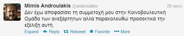 “Δεν έχω αποφασίσει τη συμμετοχή μου στην Κοινοβουλευτική Ομάδα των ανεξάρτητων αλλά παρακολουθώ προσεκτικά την εξέλιξη αυτή”, έγραψε ο Μίμης Ανδρουλάκης στο twitter.
