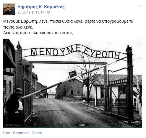 Ο Δημήτρης Καμμένος είχε αναρτήσει πριν από τέσσερις ημέρες στον προσωπικό του λογαριασμό, μια φωτογραφία στην οπόια η επιγραφή «arbeit macht frei» στην είσοδο του Άουσβιτς έχει αντικατασταθεί από τη φράση «Μένουμε Ευρώπη». Τη φωτογραφία συνοδεύει το σχόλιο του βουλευτή των Ανεξαρτήτων Ελλήνων: «Μένουμε Ευρώπη, λένε, πάση θυσία λένε, φέρτε να υπογράψουμε τα πάντα όλα λένε. Λέω ναι, αφού πληρώσουν το κόστος.»