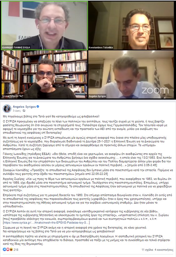 Με αυτή τη λογική κινούμενος ο ΣΥΡΙΖΑ απομόνωσε μία αμιγώς ιστορική αναφορά που έκανα στο πλαίσιο μίας υποδειγματικής συζητήσεως για το νομοσχέδιο, που διοργάνωσε διαδικτυακά τη Δευτέρα 25-1-2021 η Ελληνική Ένωση για τα Δικαιώματα του Ανθρώπου. Κατά τη συζήτηση ξεφύγαμε από το σήμερα και αναφερθήκαμε σε πρακτικές άλλων εποχών. Τα «επίμαχα» αποσπάσματα έχουν ως εξής: