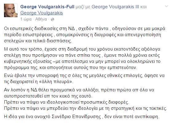 Την κατάσταση στο εσωτερικό της Νέας Δημοκρατίας, με αφορμή την ηγεσία του κόμματος, σχολιάζει ο Γιώργος Βουλγαράκης, με ανάρτηση του στο Facebook. Συγκεκριμένα, έγραψε: