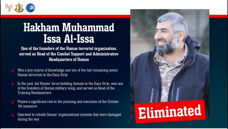 Σύμφωνα με τις IDF, ο Hakham Muhammad Issa Al-Issa ήταν βασική πηγή γνώσης και ένας από τους τελευταίους εναπομείναντες ανώτερους τρομοκράτες της Χαμάς στη Λωρίδα της Γάζας, οι οποίοι κατείχαν υψηλές θέσεις πριν από τις 7 Οκτωβρίου 2023.